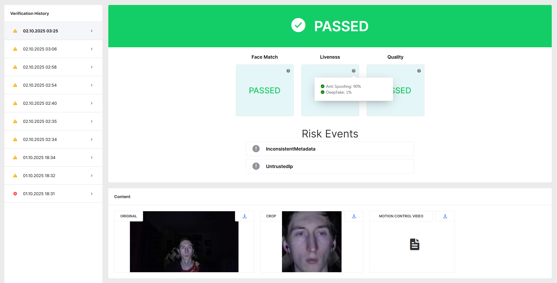 Теперь видно, сколько попыток регистрации блокируется именно из-за срабатывания дипфейк-детектора. Метрика помогает отслеживать динамику атак — растет ли число дипфейков при онбординге, на каких платформах чаще происходят попытки и происходят ли ложные срабатывания.